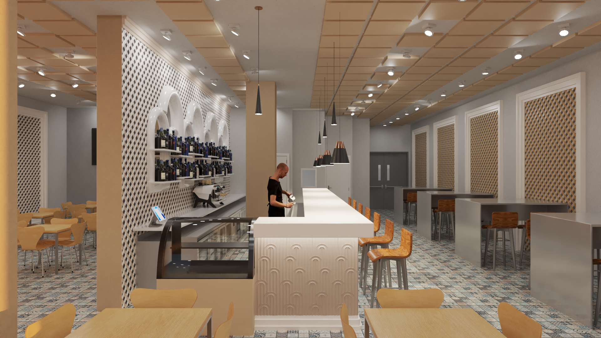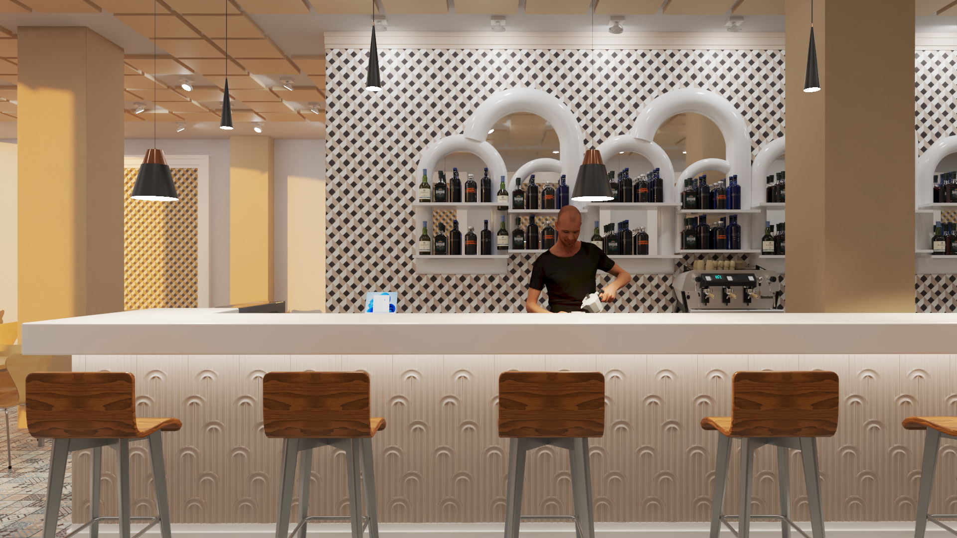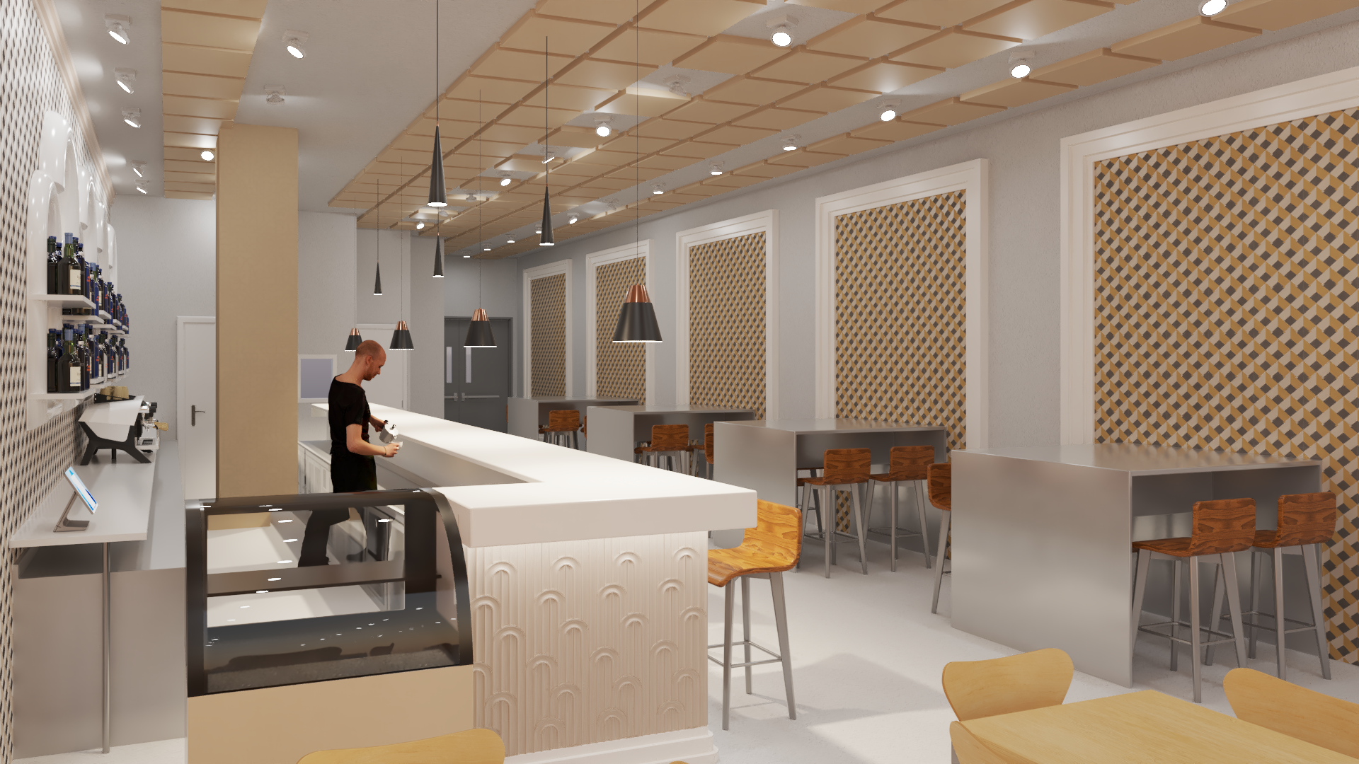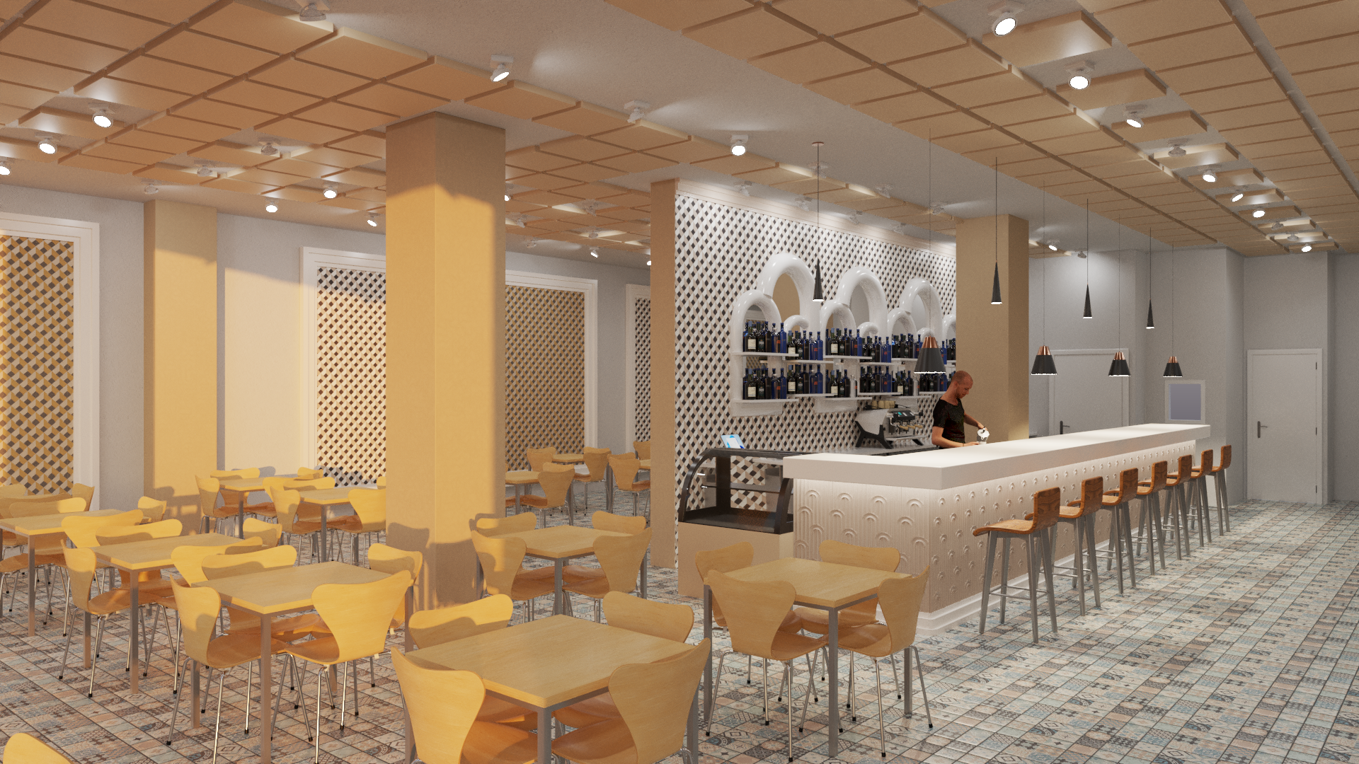 Esta propuesta transforma un restaurante típico granadino con un toque moderno en el área de la barra. Se implementa un papel pintado geométrico en tonos ocres y amarillos, con cuadros rectangulares rodeados de molduras blancas que forman un elegante marco.